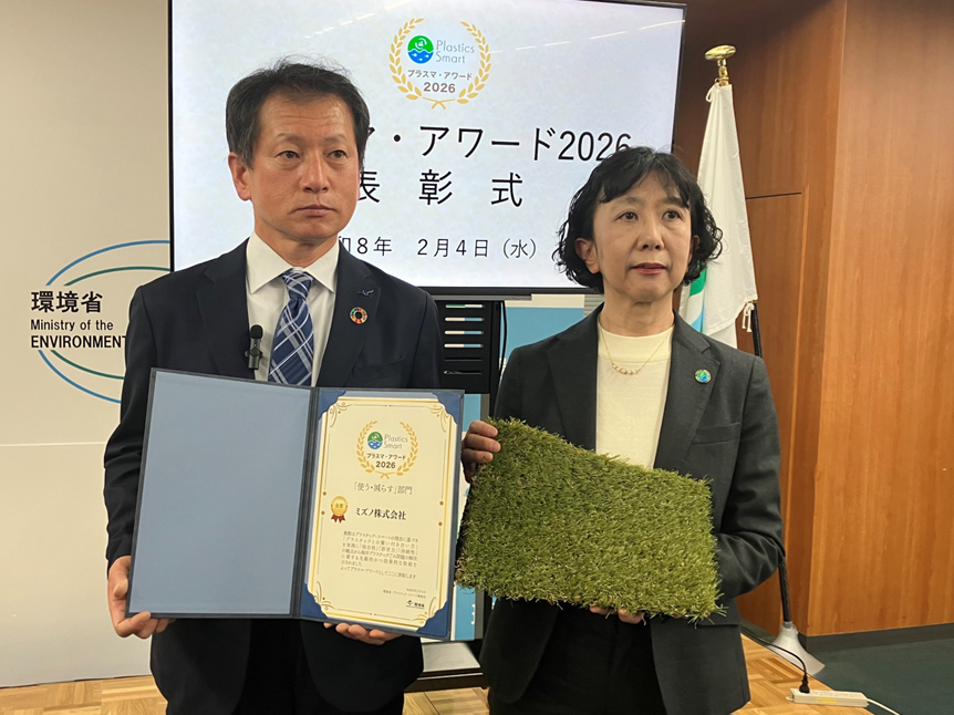 「海中環境でも分解する樹脂を採用したスポーツ用、景観用人工芝葉および充填材※1」が環境省主催「スマプラ・アワード2026」使う・減らす部門において金賞を受賞しました。
